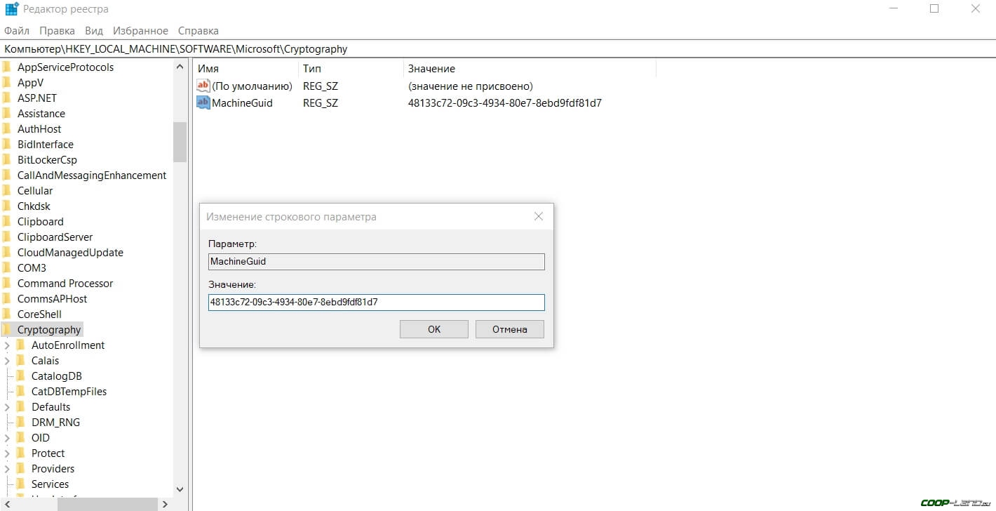 нажмите на папку Cryptography). - В результате появится окно справа, где и находится параметр MachineGuid по нему нужно нажать два раза