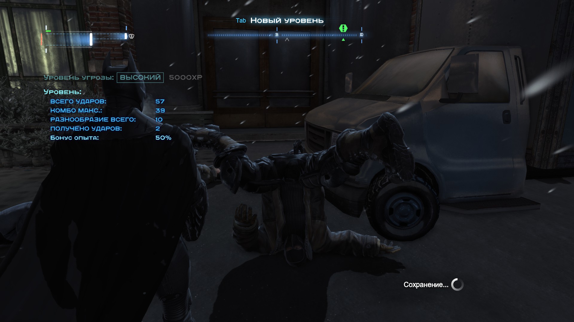 А что в игре с боёвкой? Она в некотором роде казуальна. Всего нам понадобится только четыре клавиши, не считая дополнительные. Но если поиграть, то вы понимаете, что не всё так просто. Если вначале игры всё несложно, то постепенно вы понимаете, что становится сложнее. Всё дело в количестве и разнообразие противников. У нас есть обычные вышибали, непредставляющие большой угрозы, ниндзя, противники с мачете, электродубинкой, автоматическим оружием, противники под Веномом и люди в броне. Для каждого вида нужен особый подход. К примеру, противника с ножем вы контратаковать не сможете или к человеку с электродубинкой напролом пройти нельзя и т.д. А как же боссы? К сожалению или к счастью, но их немного. Я ожидал, что боссов будет больше, но Электрошокера за босса вообще считать нельзя, ведь вырубите вы его с одного удара. Бои с боссами напряженные и руки могут вспотеть. Но Бетмен у нас не Супермен, поэтому пуль он боится и с врагами, превосходящих его в количестве и тем более с автоматами и дробовиками он не особо любит, ведь бьют они больно. Специально для таких схваток были придуманы специальные комнаты, в которых есть гаргульи и прочие вспомогающие объекты. На таких локациях надо быть тихим и быстрым, чтоб вас не заметили и не пустили пару пуль вам навстречу, но иногда враги могут повести себя странно. Бывает так, что вы оглушили врага прямо на глазах у его товарища, но он ничего не заметил и пошёл себе дальше.
