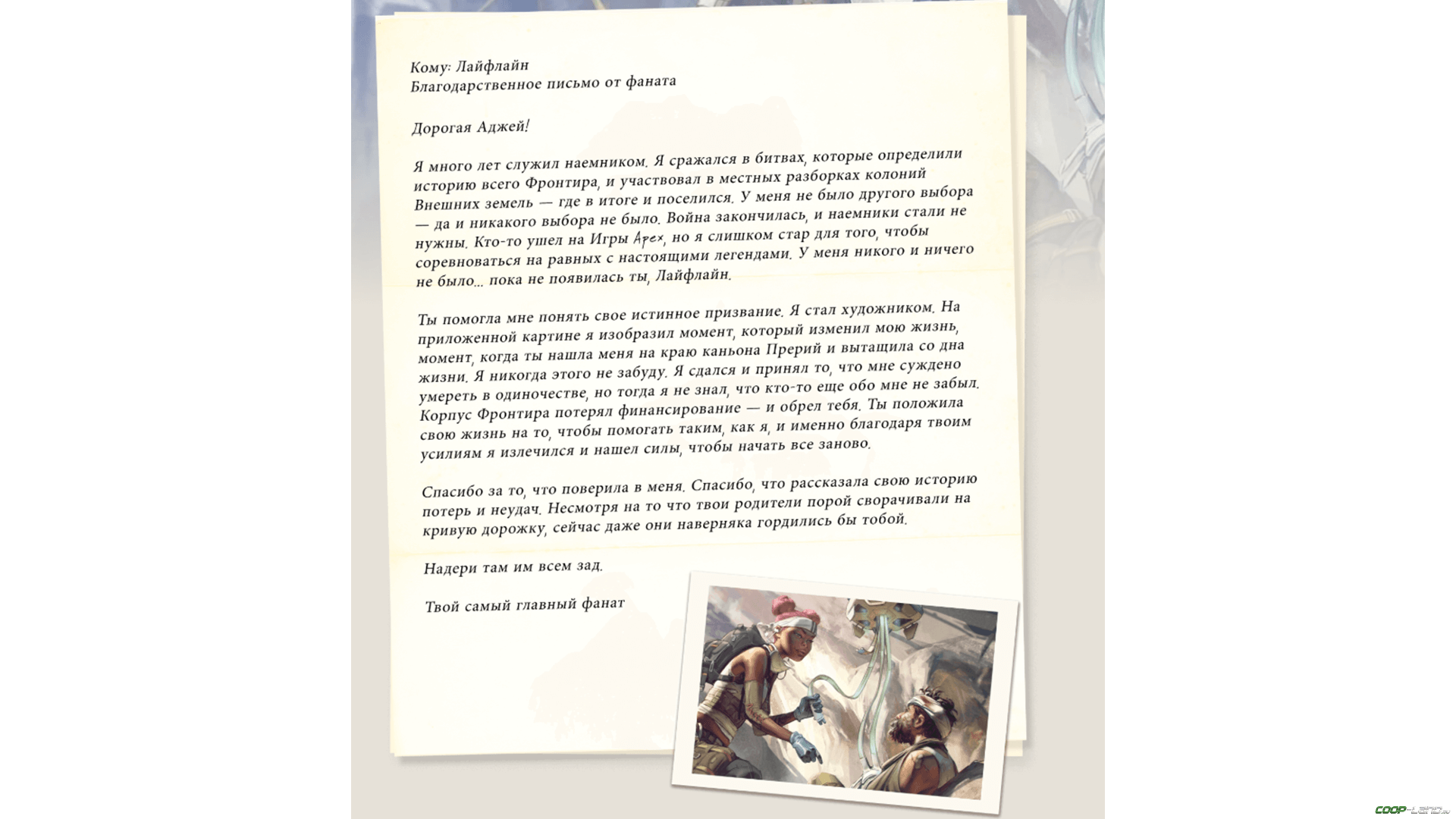 С тех самых пор вся ее жизнь посвящена заботе о других, а в Играх Apex она участвует, чтобы выиграть средства для Корпуса Фронтира и помогать пострадавшим в войне. Так она пытается искупить вину за то, что совершили ее родители. А вот письмо от ее преданного фаната, которого она когда-то спасла от верной гибели: