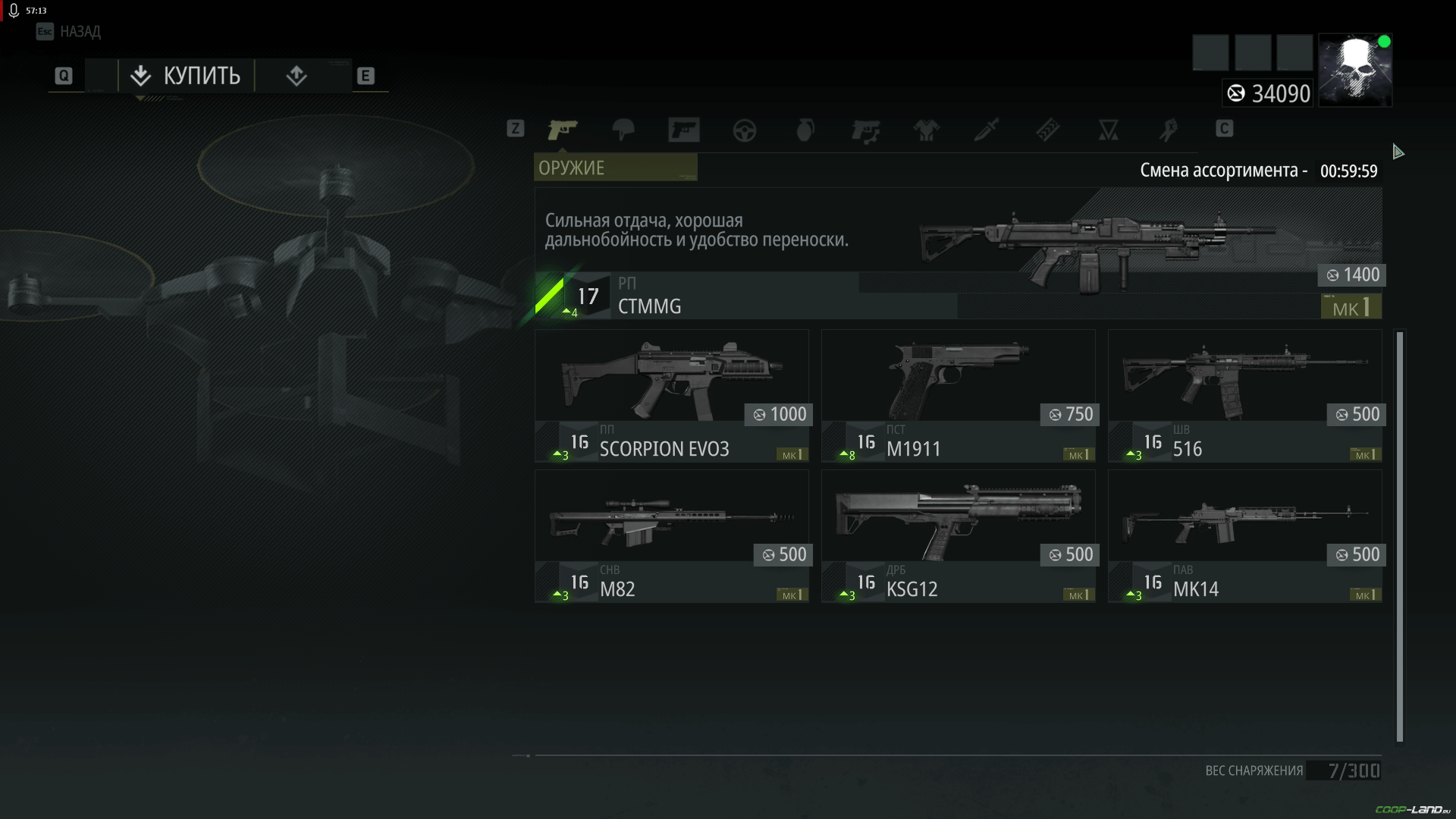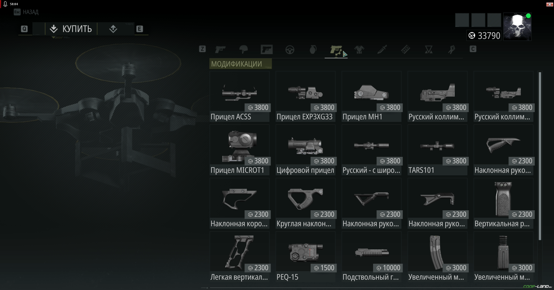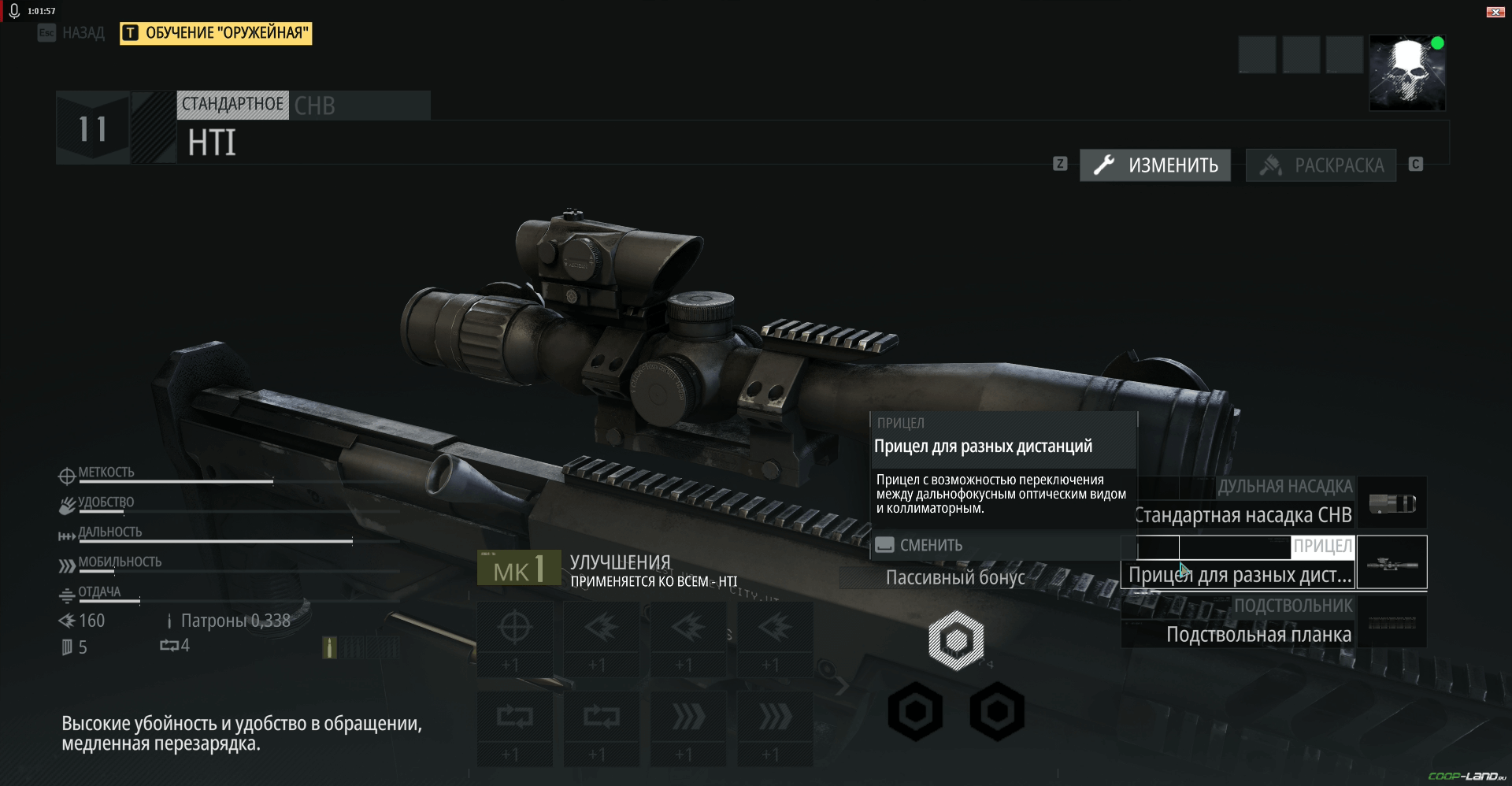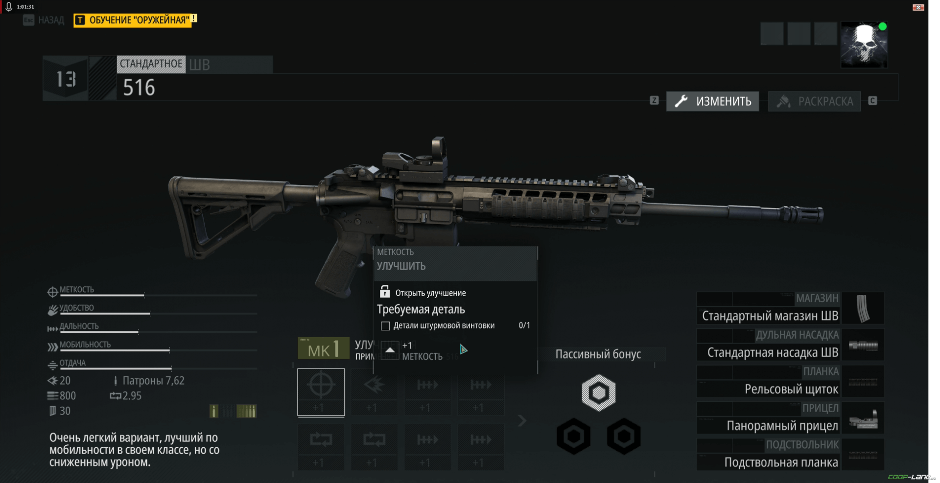 Еще мы имеем местный магазинчик, где можно прикупить всякой всячины, самое что интересное там есть это оружие и модификации для него. Сменить прицел и прочее навесное оборудование, улучшить пушки можно в инвентаре. Для улучшения необходимы материалы, которые можно получить разобрав старое оружие.