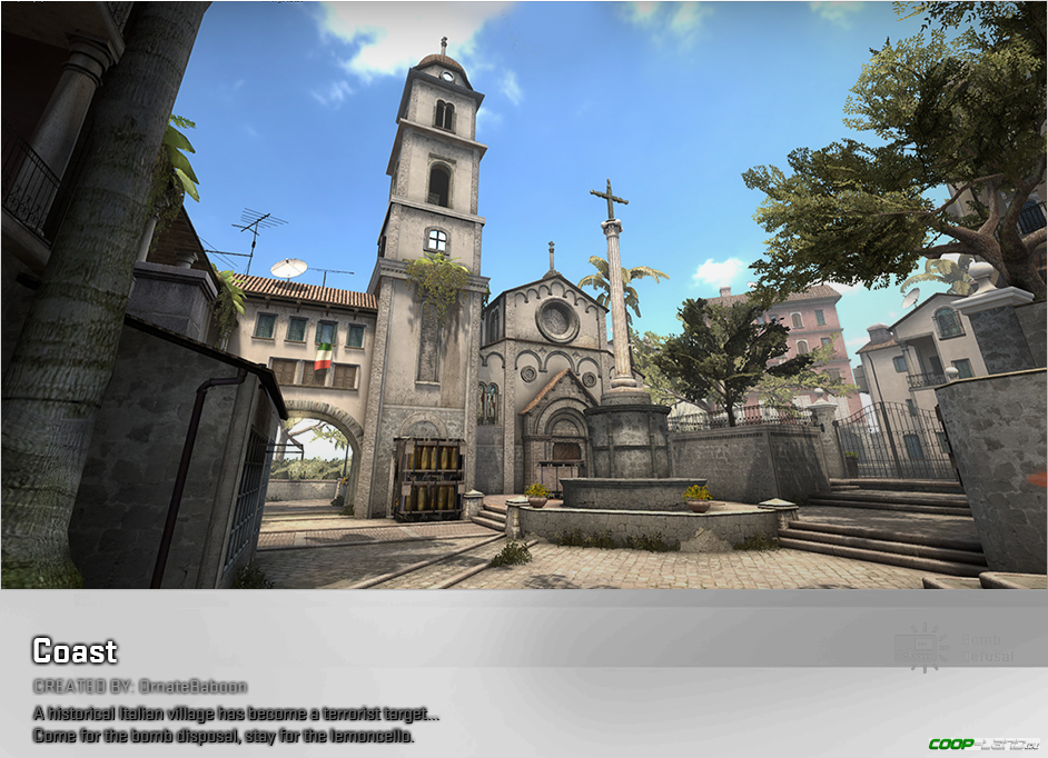 1. Первая карта называется Coast, расcчитана на соревновательный режим с обезвреживанием бомбы, внешне напоминает побережье Италии, так-же отличается красивыми пейзажными видами.