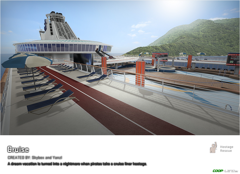 3. Третья карта называется Cruise, представляет собой довольно роскошный огромный круизный корабль. Так-же у карты имеется своя предыстория "во время абордажа пираты взяли заложников, службе безопасности удалось эвакуировать большую часть пассажиров, но так как часть заложников осталась на корабле - это дело было передано команде Тюленей-6, для проведения спасательной операции".