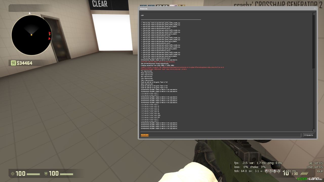 Ну и уже более известный всем баг, или фича...в общем называйте как хотите. Отлично подойдет для оттачивания стрельбы с ноузумом/ноускопом. Для этого нам нужно открыть консоль, ввести любой текст, выделить его, и перетащить мышкой за пределы консоли, таким образом у нас получится некое подобие прицела...между прочим в мм оно тоже работает. Собственно скрины этого чуда: