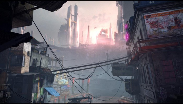 Париж будущего; вдалеке виднеется район для богатых, путь к которому заказан для лепырей.