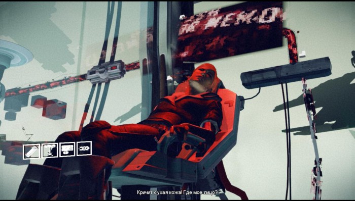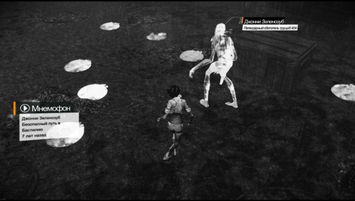 Добираемся до тележки и на ней перебираемся в бар «Мозговая течь». Подходим к стойке, где нас встречает Томми-Болиголов, бывший охотник за воспоминаниями, с распростертыми объятьями. Первым делом приоденемся в привычную форму. В отличие от нас, Томми сделали полную прочистку. Только нам следовало заговорить об охотнице Ольге Седовой, как она тут же появилась за нашей спиной. Нажимаем показанную кнопку и погружаемся в воспоминания Ольги. Нужно изменить прошлое таким образом, чтобы ее муж погиб от рук доктора Куэйда. Наша задача, отыскать точки входа в память и подкорректировать воспоминание. Возвращаемся к самому началу, перемотав время.