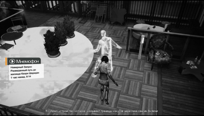 Цепляемся за красную трубу в углу и поднимаемся на самый верх. Перепрыгиваем на рекламный щит, когда его элементы начнут переворачиваться. Во время движения нажимаем соответствующую кнопку, чтобы как можно скорее перебраться на другую сторону. Пройдя через здание, продолжаем идти по крыше. Запрыгиваем на выступ, дождавшись прекращения подачи электричества. Сразу же перепрыгиваем направо, как только прекратиться подача электричества на той стороне. Добираемся до Неверного Запроса, от которого получаем подробный маршрут к дому Каори Шеридан. Пройдя в помещение, встаем на подсвеченную область и активируем мнемофон. Проходим к следующему мнемофону, активируем его и целимся в Неверного Запроса. Быстро и часто жмем показанную кнопку. После удачной синхронизации, подходим к панели управления и открываем дверь.