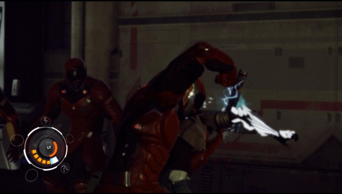 Одержав победу, заполучаем спамер, который позволяет не только выводить из строя врагов, но и отпирать двери. Целимся в якорь силового поля и производим выстрел. Отключаем еще два аналогичных якоря. Подходим к аварийному выходу и отпираем дверь, выстрелив в якорь над ней.