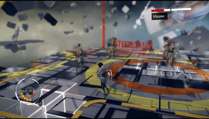 Поднимаемся на лифте, после чего перемещаемся в искусственно созданный мир. На первом этапе, заземляем Мадам мощным выстрелом из спамера (или сенсином «Флуд») и атакуем ее. Уничтожение проекций поможет восполнить здоровье и как можно скорее восстановить заряд необходимый для спецприемов. На втором этапе, помимо всего перечисленного придется бегать по всей территории и избегать падающих сверху осколков. На третьем этапе, как только заземлим Мадам (желательным мощным выстрелом из спамера), атакуем ее, или ждем, когда она создаст клонов, и используем сенсин «Флуд». Добиваем Мадам, нажимая показанные на экране кнопки.