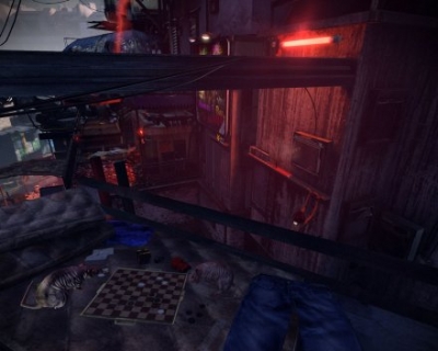 Продолжаем движение по коридору, пока не обнаружим ботов. Закрываем ставню центральной комнаты. Забегаем в комнату перед нами и перебираемся в самую последнюю. Разворачиваемся и открываем ставню третьей комнаты. Возвращаемся в коридор, пройдя через все комнаты. Открываем ставню второй комнаты и, когда боты будут находиться в них, сможем пройти дальше по коридору. Выбираемся наружу и идем налево. Поворачиваем кран, хватаем подвешенный контейнер спамером и передвигаем его налево. Цепляемся за контейнер, смещаемся налево и залезаем наверх. Сразу же активируем рычаг с левой стороны и поворачиваем кран. Запрыгиваем на здание.