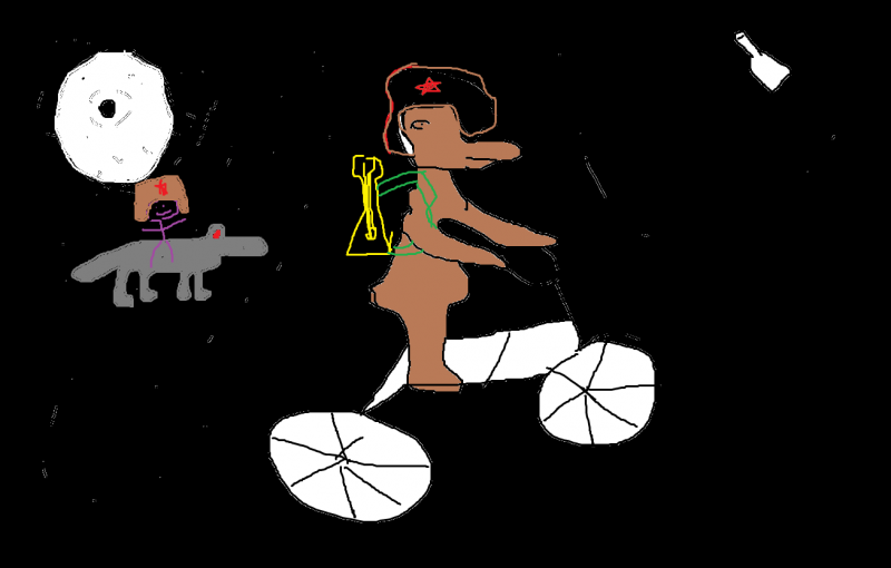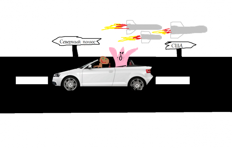 нарисуйте мне афроамериканеца который едет на северном полюсе в кабриолете с орущим патриком на заднем сидении на фоне ракет летящих в сша