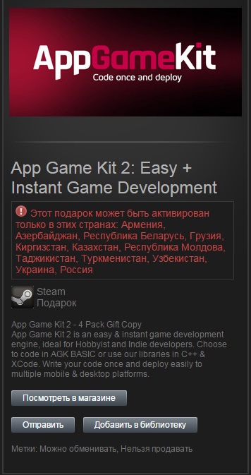 Есть гифт App Game Kit 2: Easy + Instant Game Development