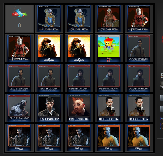 1.Хочу обменять карточки с моего инвентаря(см.скриншоты) 2.Обменяю на карточки с игр:Tom Clancy's The Division,Dying Light,Dead by Daylight,Killing Floor 2,Spintires,Skyrim,Mad Max,Left 4 Dead 2 3.Steam:kelt545(синяя ава) 4.Обмен в Steam по обоюдному соглашению