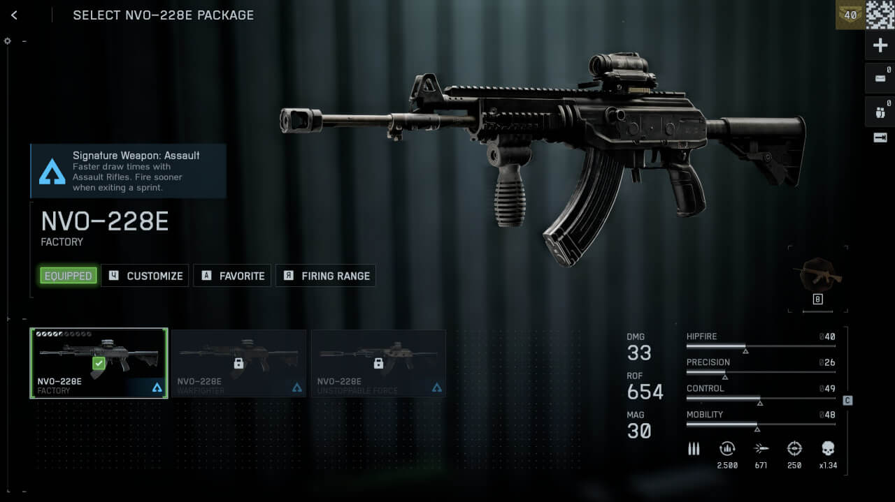 С показателями 33 единицы урона за выстрел, штурмовая винтовка NVO-228E демонстрирует идеальное сочетание убойной силы и управляемой отдачи. Текущий показатель контроля делает её смертоносно точной в продолжительных перестрелках.