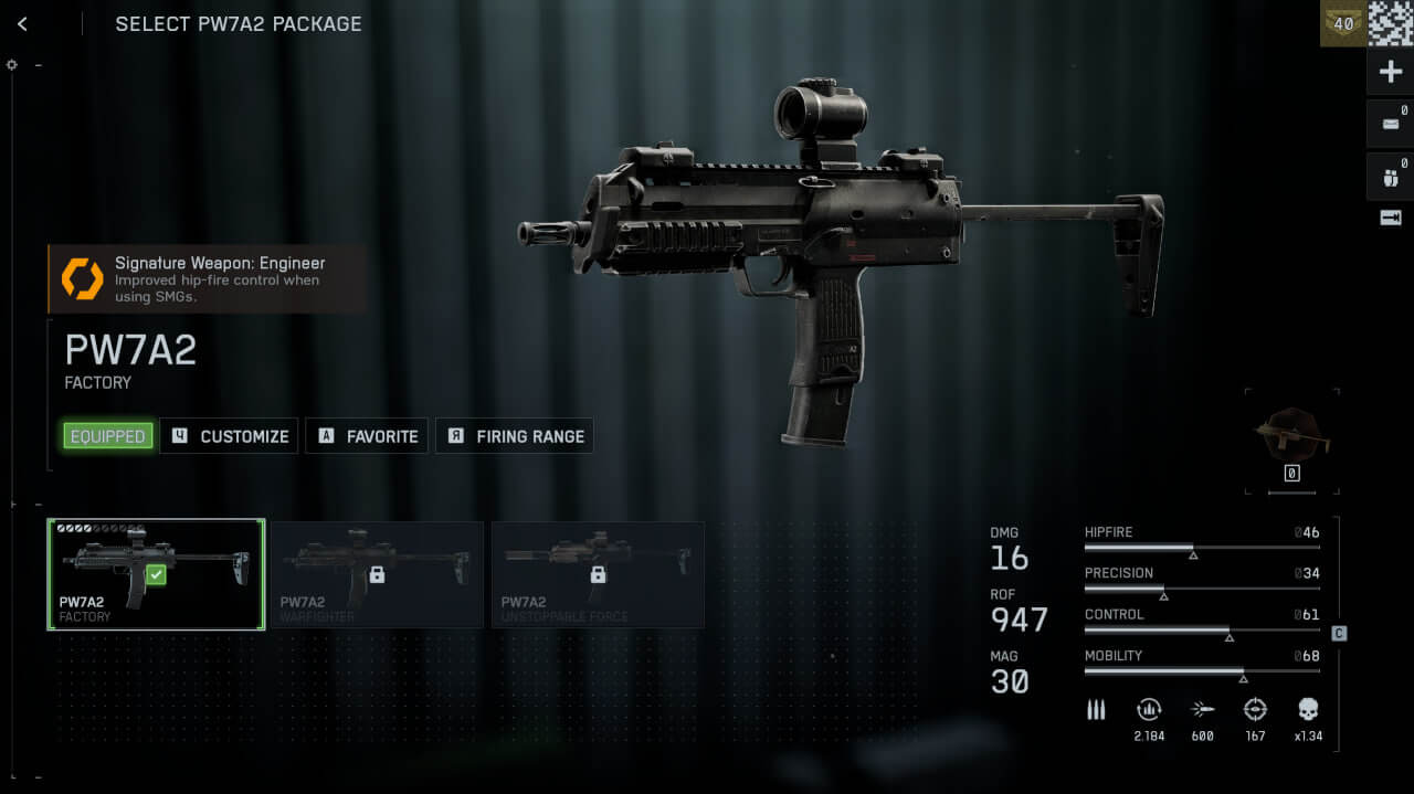 Пистолет-пулемёт PW7A2 выдаёт 947 выстрелов в минуту контролируемой агрессии с неожиданно хорошей эффективностью на средних дистанциях. Контроль на уровне 52 позволяет ему конкурировать за пределами типичного радиуса действия ПП.