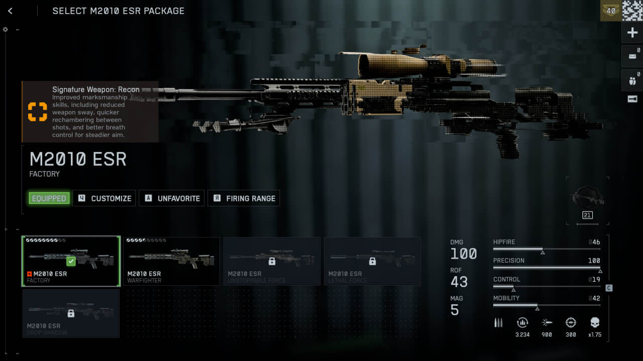 Нанося 100 единиц урона за выстрел при безупречной точности 100, снайперская винтовка M2010 ESR гарантирует устранение цели на любой дистанции. Скорострельность 43 выстрела в минуту требует терпения, но вознаграждает меткость непревзойдённой летальностью.