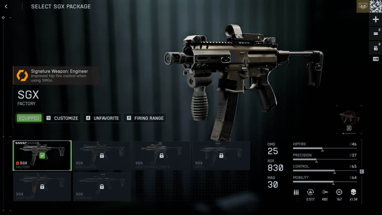 С 830 выстрелами в минуту и превосходными характеристиками стрельбы от бедра, SGX доминирует в закрытых помещениях и на точках, где мобильность превосходит дальность.