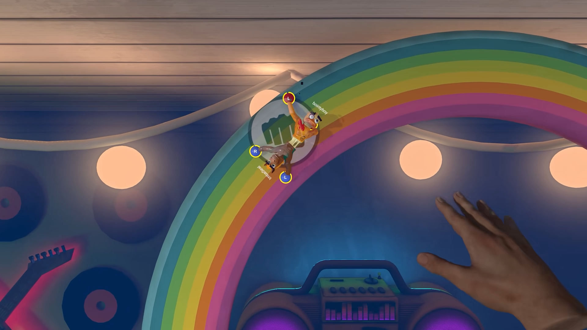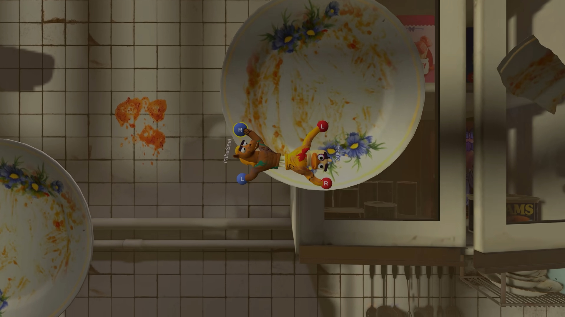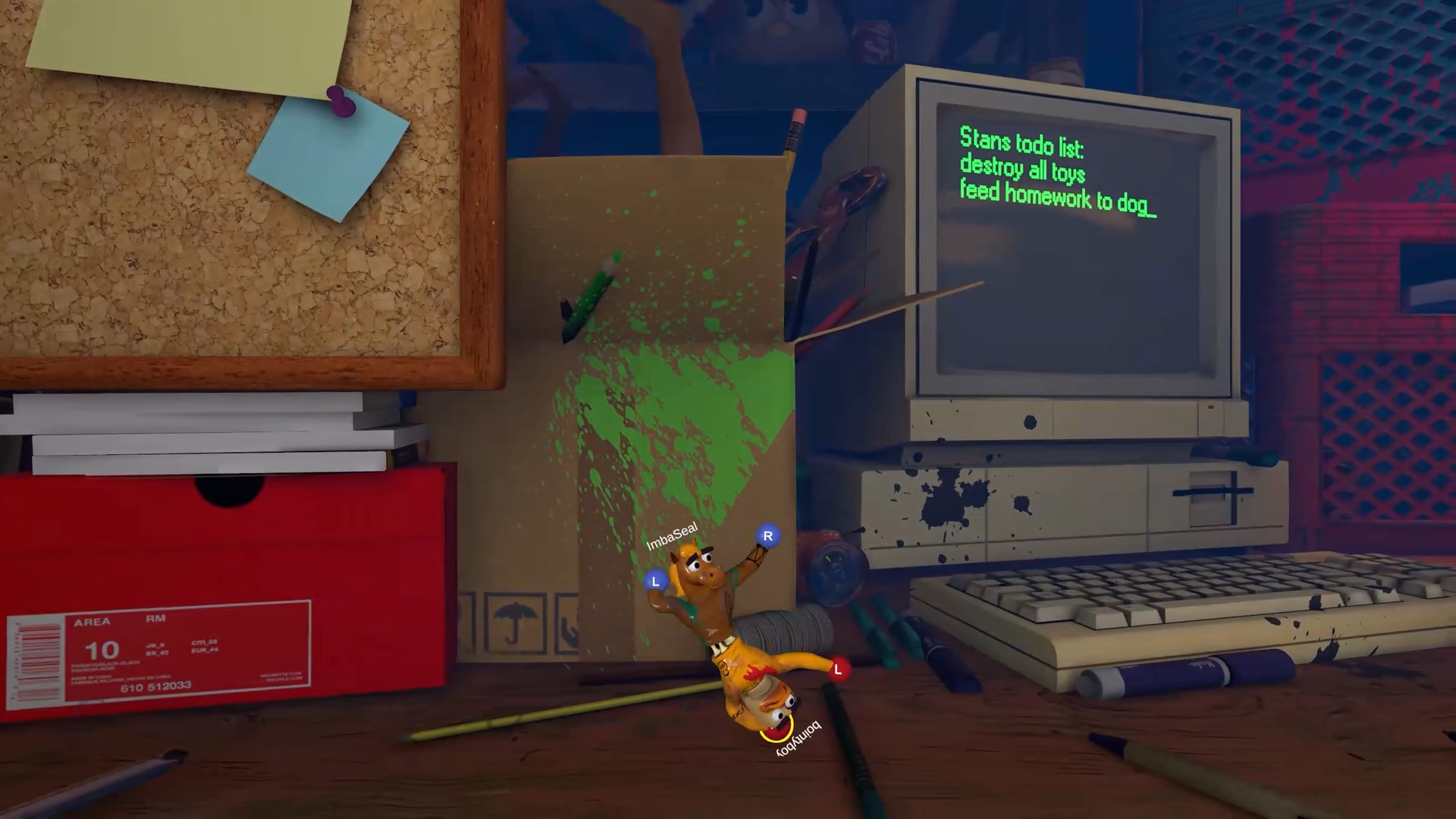 Кооперативный режим станет обязательным условием прохождения Stuck Together – два игрока будут управлять своими половинками игрушек и тщательно синхронизировать все свои действия. Здесь практически нет ровных поверхностей, а игрокам придется все время карабкаться на возвышенности, раскачиваться и прыгать через препятствия, изобретать импровизированные лестницы и многое другое. Надо быть осторожным, ведь тяжелая мебель может придавить героев, а промах в прыжке отбросит их к началу уровня.