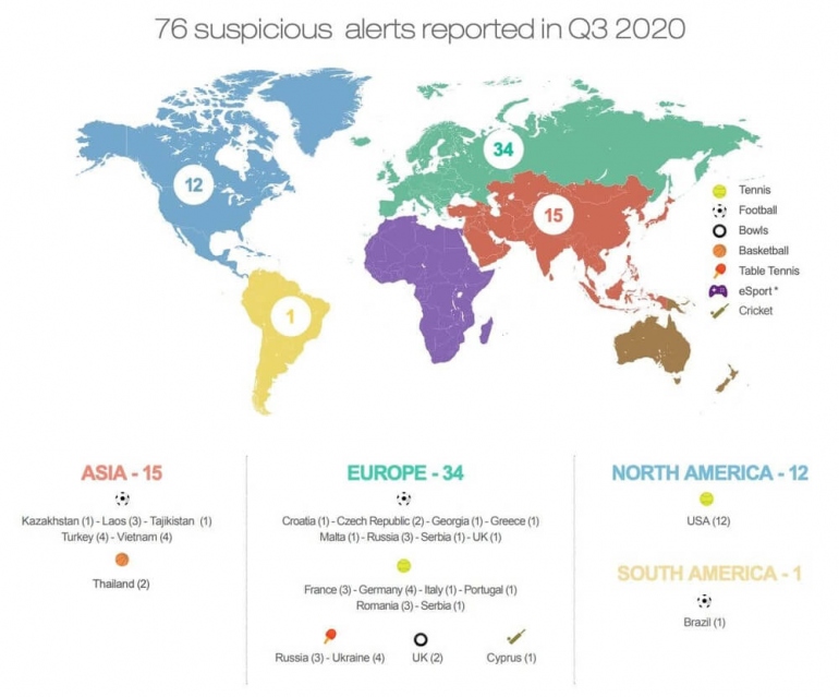 С 1 июля по 30 сентября специалисты засекли как минимум 76 подозрительных ставок. Из них по 25 пришлось на футбол и теннис, третьим в списке 322-деятельности следует киберспорт с 14 ставками. Больше всего активности пришлось на Европу и Азию, хотя разделение на регионы от IBIA не совсем очевидно.
