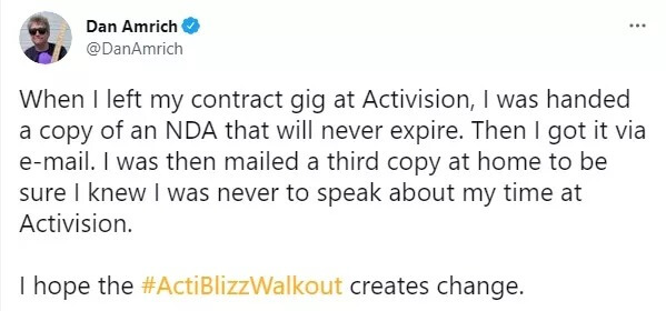 Приблизительно 0 попаданий. Поэтому теперь волну возмущения поймали и сотрудники Activision – они стали жаловаться на контракты, в которых прописано вечное соглашение о неразглашении и другие оговорки, которые ставят их в уязвимое положение перед Activision. Например, о до сих пор действующих ограничениях отчитался Дэн Амрич, бывший коммьюнити-менеджер Activision.