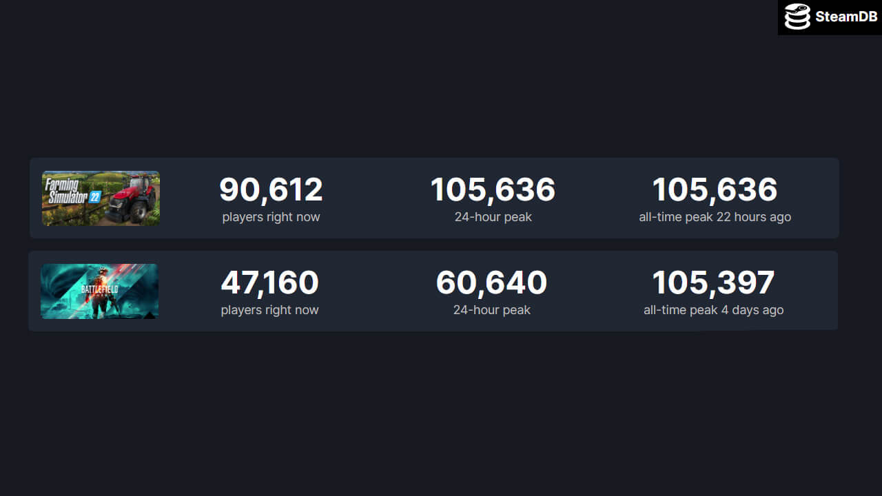 Интерес игроков к сборке урожая оказался выше, чем к стрельбе в Battlefield 2042. Пиковый онлайн шутера остановился на 105400, а средний онлайн едва достигает 47000 игроков. Пахари обогнали солдат! Хотя бы на ПК. На консолях ситуация чуть иная, но Battlefield 2042 все равно не пользуется успехом прочих игр серии.