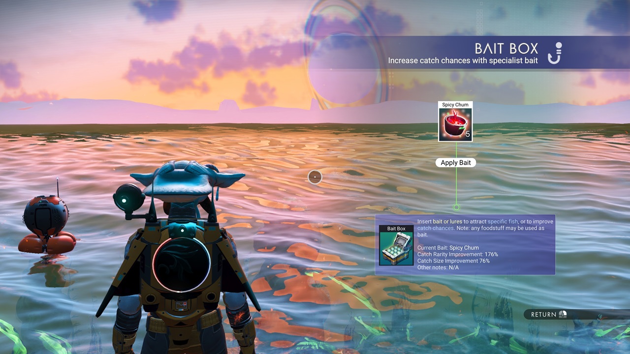 Научно-фантастическая песочница No Man's Sky получила свежее обновление Aquarius, добавляющее ранее безводным планетам огромные водные просторы и разнообразных рыб, из которых можно сварить ароматную уху. Главным инструментом для ловли рыбы станет обыкновенная удочка, с помощью которой можно удить привычных пескарей и неизвестных морских млекопитающих.