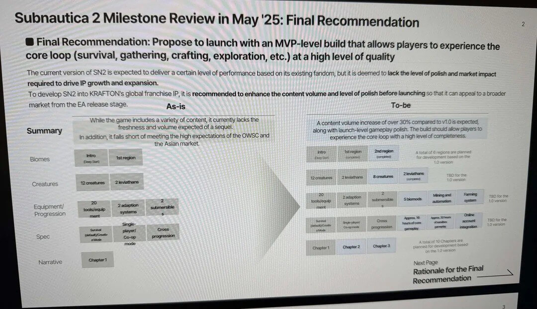 На одном из слитых документов Krafton перечисляет контент ранней версии Subnautica 2, готовый к лету 2023 года. Там указаны вступление, один доступный для исследования регион, дюжина рыбех, пара больших босс-рыбех, охапка инструментов и одна сюжетная глава.