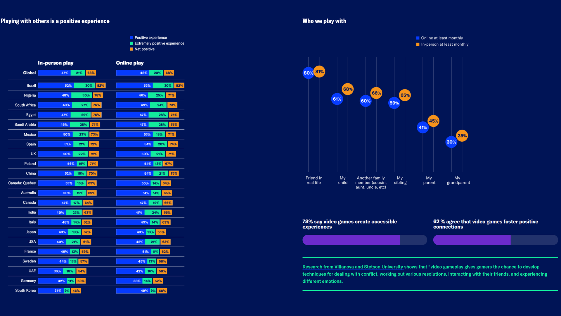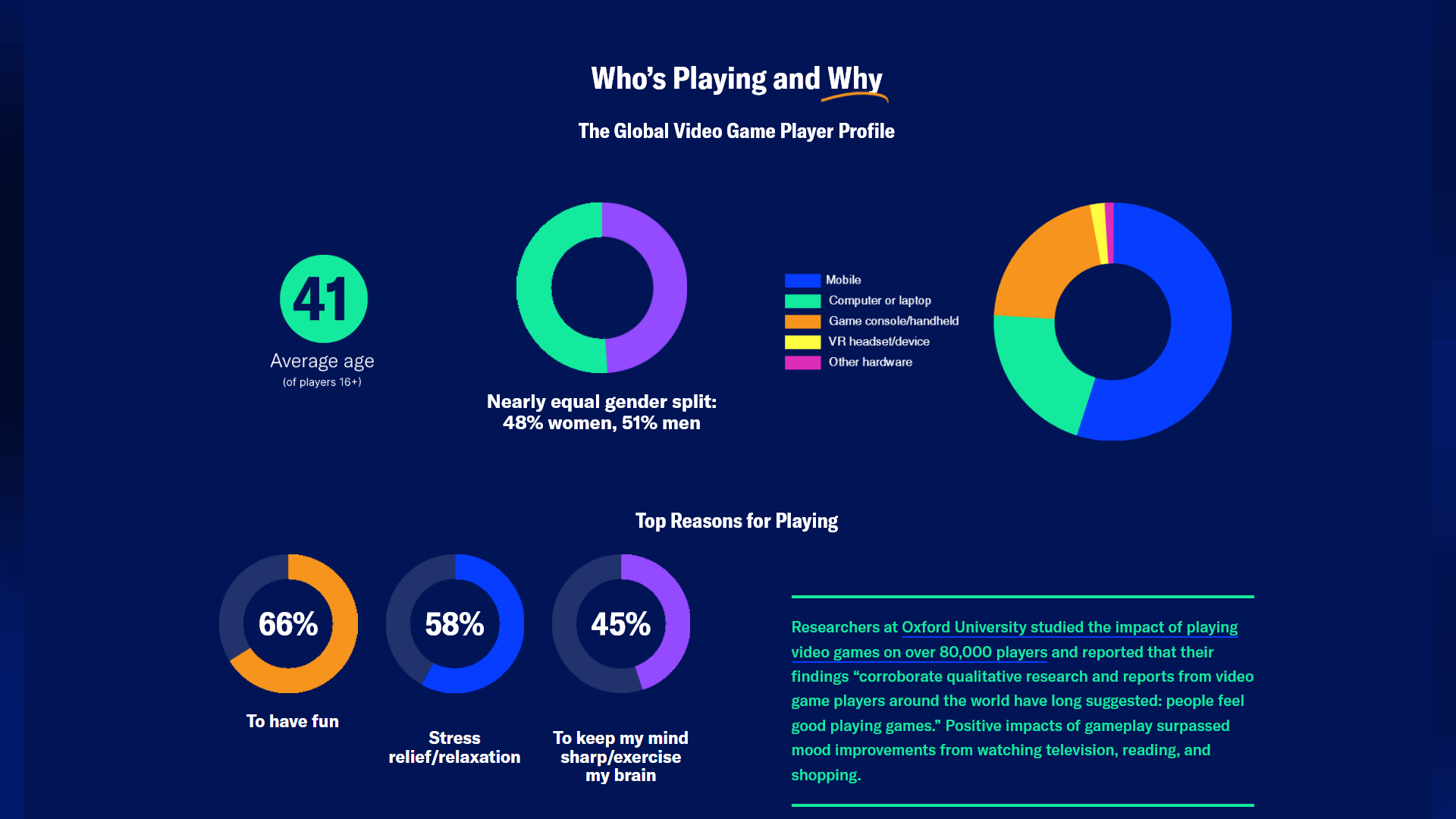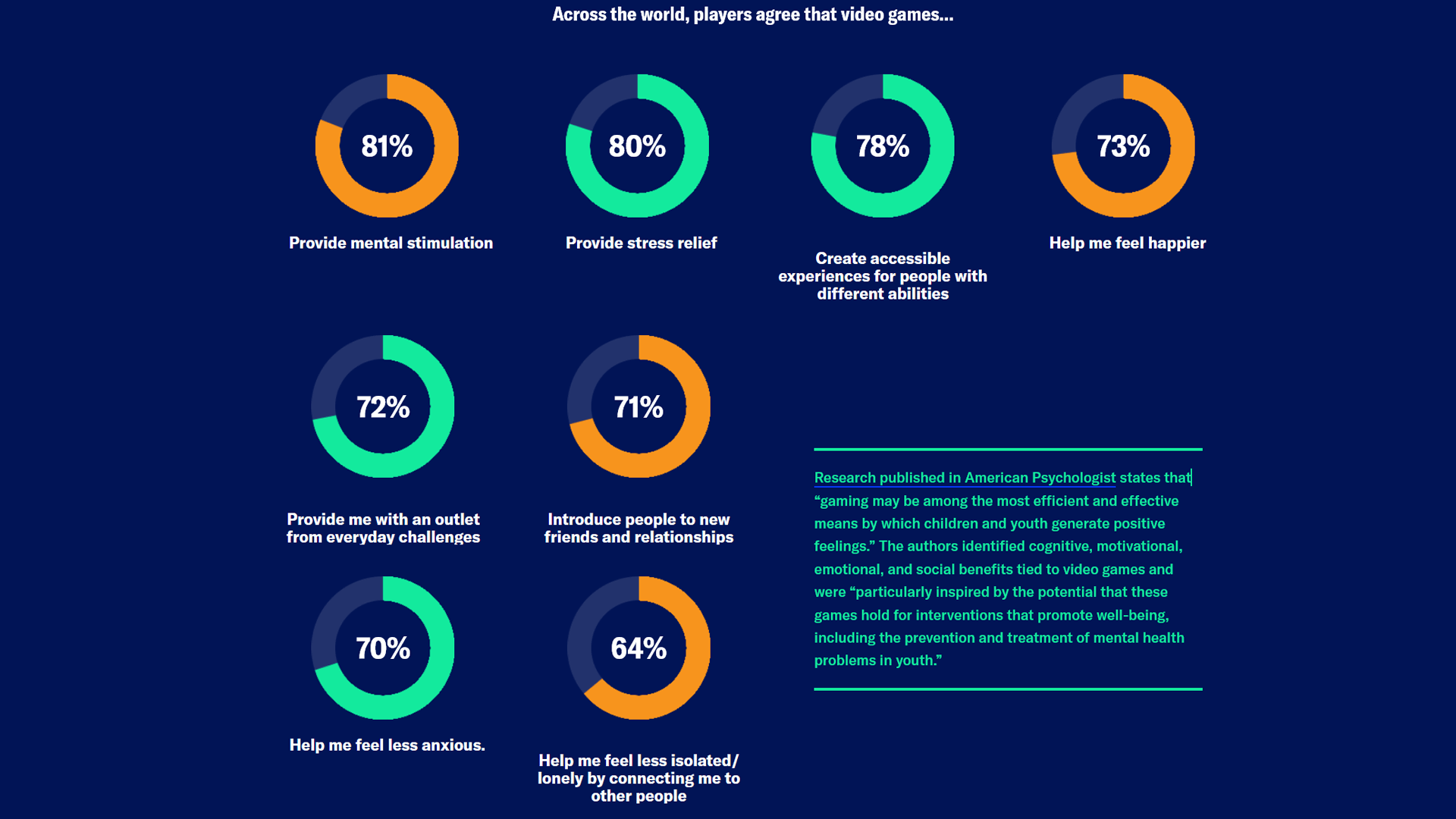 Дальше исследователи задались насущными вопросами: зачем люди играют и как это на них влияет. Главными причинами, по которым люди играют в видеоигры, являются получение удовольствия (66 %), снятие стресса и релаксация (58%), а также стремление поддерживать остроту ума (45 %). Игроки по всему миру отмечают значительное положительное влияние игр на свое психическое благополучие: игры стимулируют умственную активность (81 %), помогают справляться со стрессом (80 %), дарят ощущение счастья (73 %) и служат выходом из повседневных трудностей (72 %).