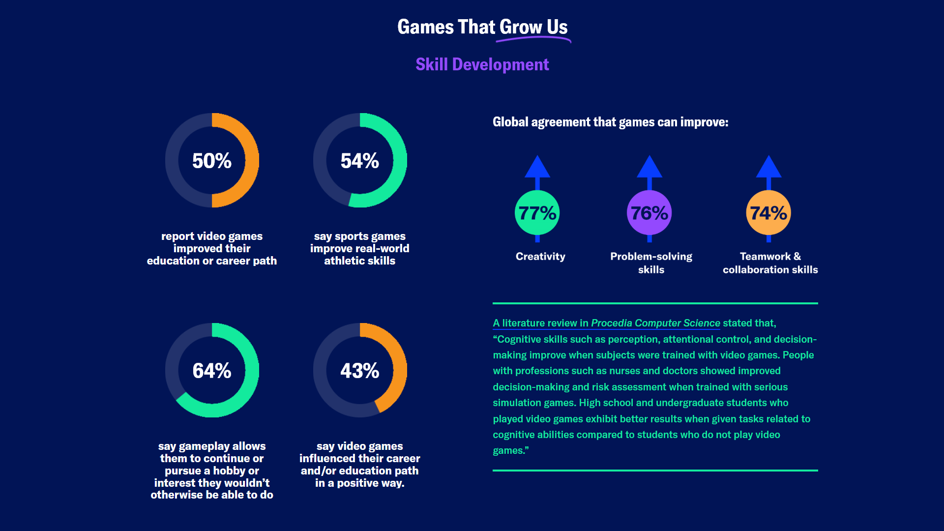 Связано ли счастье и комфорт с возможностью сводить в кино мать соперника? Ну, игры определенно укрепляют социальные связи и способствуют развитию навыков. Около 78 % респондентов отметили, что игры создают доступную среду для людей с разными возможностями, а 62 % вообще считают, что игры способствуют позитивному общению. Более того, половина опрошенных сообщила, что игры положительно повлияли на их образование или карьерный путь, а 64% заявили, что гейминг позволяет им развивать навыки и увлечения, которые недоступны им иным способом. Около 54 % считают, что спортивные симуляторы развивают их реальные спортивные навыки.