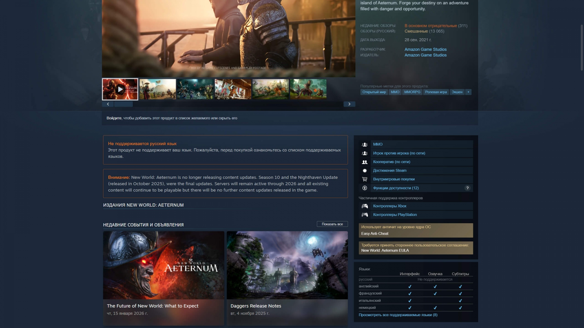 Владельцы копий сохранят доступ к серверам вплоть до их закрытия. Текущий игровой сезон продлится до самой даты прекращения обслуживания. Внутриигровой магазин New World: Aeternum продолжит работу до 20 июля 2026 года, после чего покупка валюты станет невозможной.