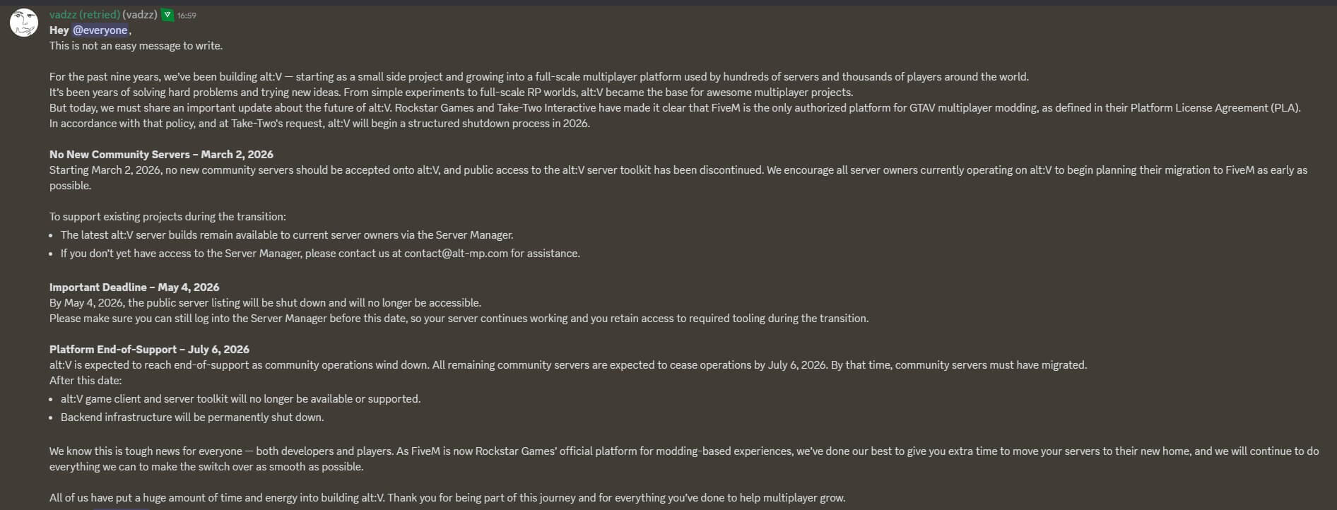 Платформа alt:V продержалась почти 9 лет.
