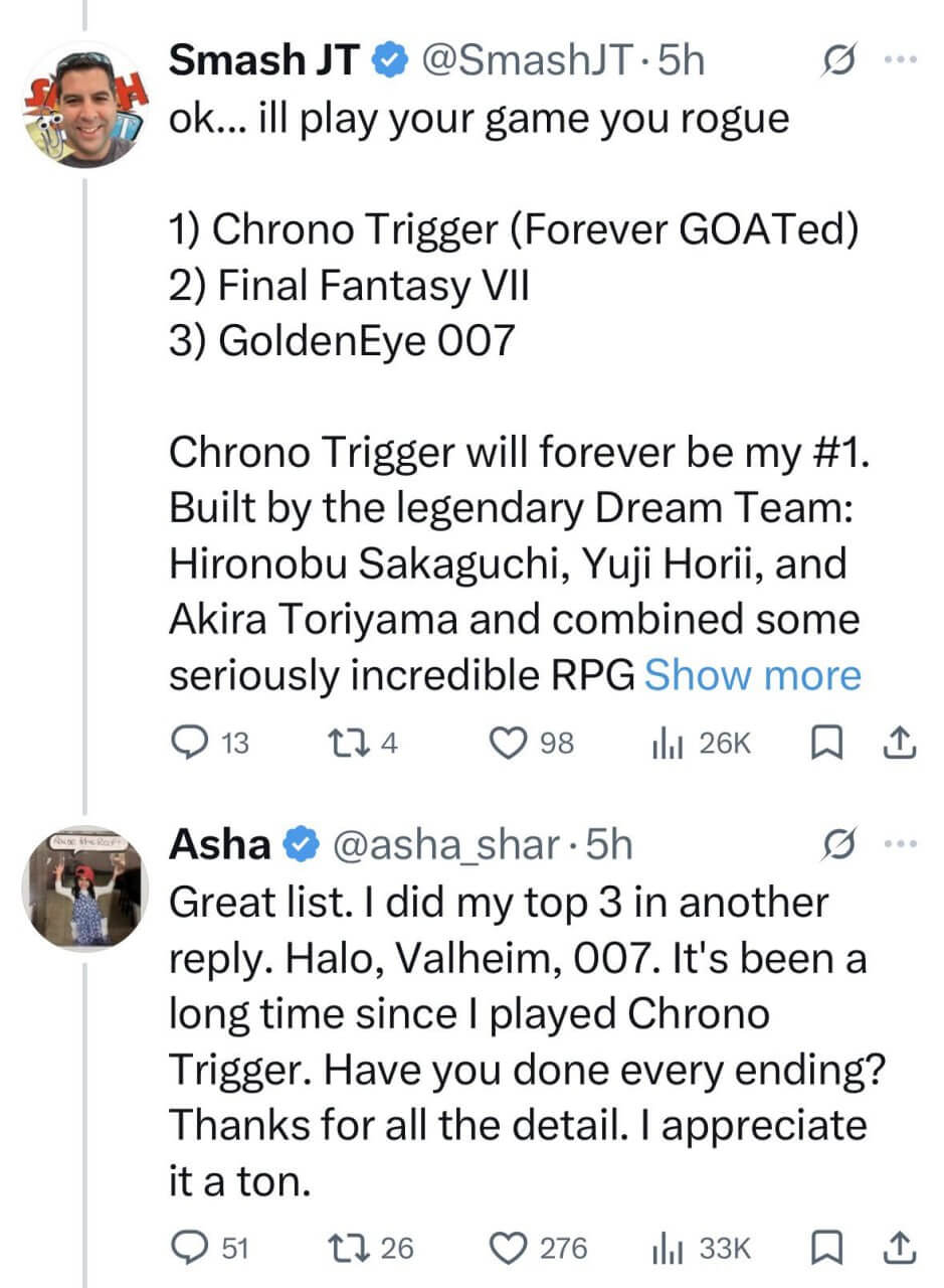 Конечно, Аша Шарма не самый очевидный преемник. Шарма максимально далека от игровой индустрии. Ее аккаунт AMRAHSAHSA в Xbox активизировался лишь месяц назад. Судя по всему, Шарма или кто-то из ее ассистентов осваивали лор Xbox Pass, включая последние части Halo. Еще Шарма отметила, что когда-то давно играла в Chrono Trigger и составила топ любимых проектов: Halo, Valheim и 007 GoldenEye. Также она похвалила Firewatch.