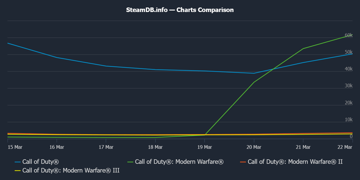 А компания Activision вспомнила про старые традиции и установила скидку в 90 % на Call of Duty: Modern Warfare (2019). Резкий обвал цены привлек огромное внимание геймеров. Количество одновременных пользователей выросло со скромных 500 человек до 33 тысяч.